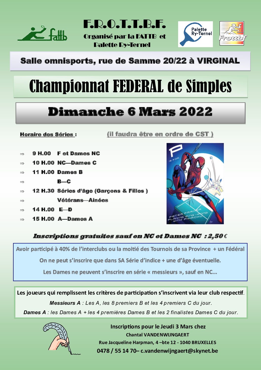 Championnat Fédéral de Simples + A Calendrier Ajouter au calendrier Ajouter au calendrier Timely Ajouter à Google Ajouter à Outlook Ajouter au calendrier Apple Ajouter à un autre calendrier Exporter vers XML Quand : 6 mars 2022 Jour entier 2022-03-06T00:00:00+01:00 2022-03-07T00:00:00+01:00 Championnat AFFICHE – Championnat fédérale de simples et A – BRABANT