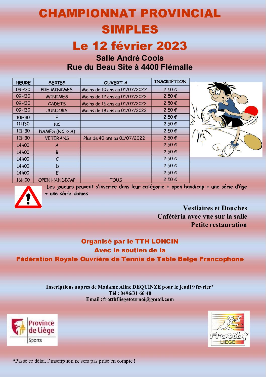 Championnat Provinciaux de Simples Calendrier Ajouter au calendrier Ajouter au calendrier Timely Ajouter à Google Ajouter à Outlook Ajouter au calendrier Apple Ajouter à un autre calendrier Exporter vers XML Quand : 12 février 2023 Jour entier 2023-02-12T00:00:00+01:00 2023-02-13T00:00:00+01:00 Championnat 2023 – Affiche Championnat Provinciaux de Simples – LONCIN